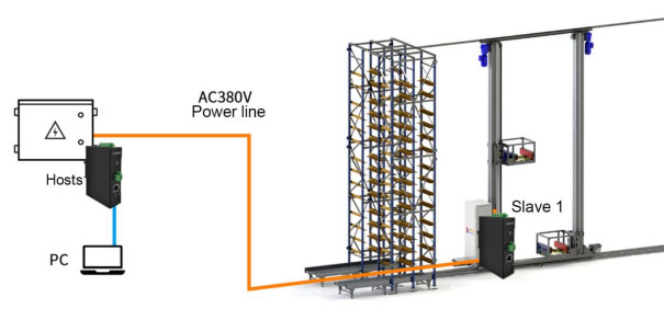 The communication between stacker cranes/shuttles and the server began to use broadband power line carrier to replace the traditional communication mode. The broadband power carrier uses the existing power slide contact cord of the stacker to carry out power carrier communication, without rewiring, without environmental interference, and realizes high bandwidth, low delay, strong expansibility and low cost communication.