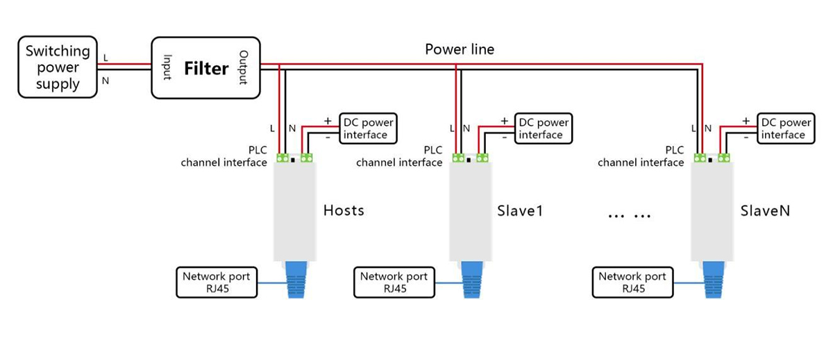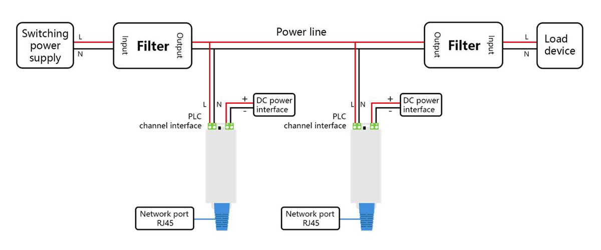 3.General type KS810NTpower line with load,need to be used with filter.The power port connects to a DC12-48V power supply,distinguish between positive and negative poles;PLC channel port is connected in parallel to the DC power line,no need to distinguish between phase sequence or positive and negative polarity.Reference wiring schematic: